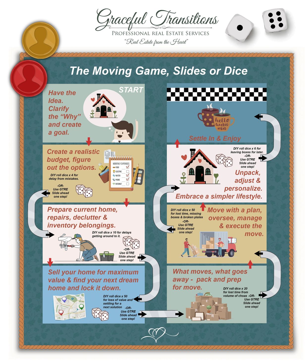 A little game of choices in the moving process. In reality there are twenty main steps that need to be completed to sell your home and make a seamless transition to your next great adventure. Here we have boiled it down to the top eight. So the name of the game is to make your move using the dice that will randomly add time, stress and chaos to the game or you can let the experts at Graceful Transitions Real Estate step in and do the heavy lifting so you get to slide right on through.